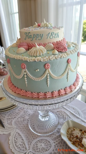 Pick a base color like baby blue, mint, or pink, then layer on shells, swags, ruffles, and tiny rosettes. Ask your baker to include “18” or your name piped in the center in retro script.