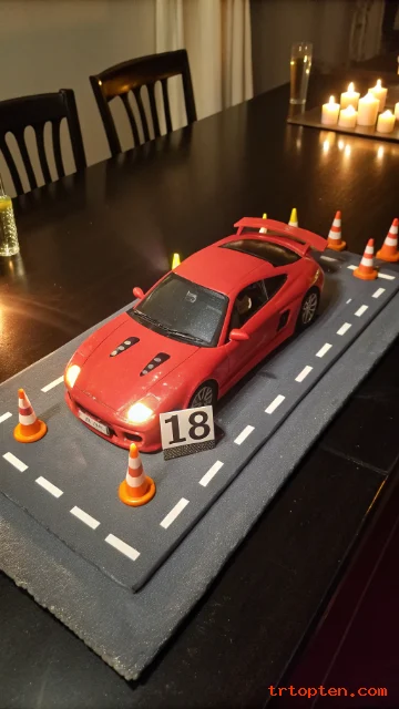 Ask for a 3D carved vehicle cake or a round cake with a detailed topper. Road markings, license plate with “18”, and tiny cones add to the look.
