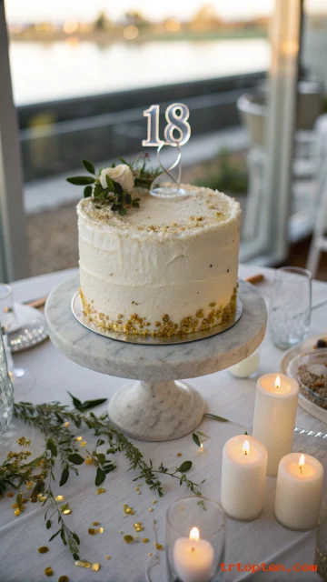 Ask for smooth white buttercream with very simple decoration. Add thin gold leaf strips, tiny gold dots, and a slim acrylic “18” topper for a sleek finish.
