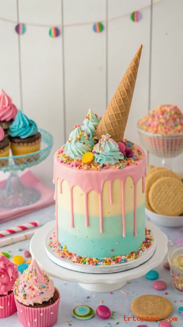 An ice cream cone drip cake feels fun and playful, perfect for a summer 18th birthday. It gives the illusion of melted ice cream spilling down the sides.