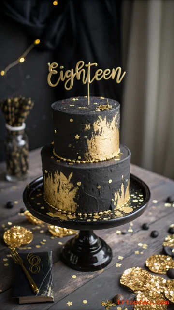 A black and gold cake gives strong “grown-up” energy and suits a classy 18th party. The bold contrast feels modern and dramatic, perfect for a milestone night.