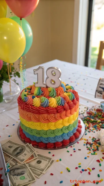 A pastel rainbow sprinkle cake feels playful but still grown-up enough for an 18th birthday. Soft colors photograph beautifully and match almost any party theme.