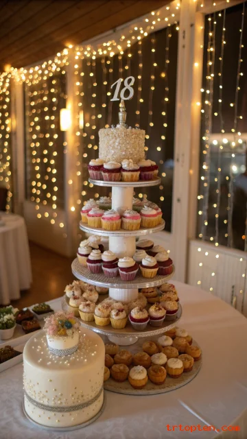 Arrange cupcakes on a stand in two or three levels. Decorate them with matching swirls and small sprinkles, then place a single small cake or a large “18” topper at the top.