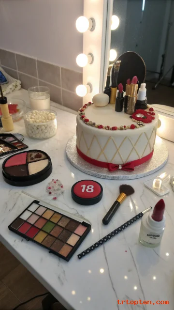 Use a round or square cake as a “vanity table.” Decorate with fondant lipstick, brushes, palettes, and a small mirror, plus a name or “18” written like a brand logo.