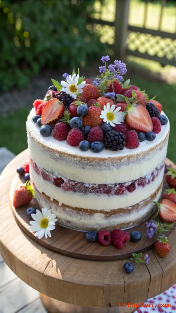 A naked berry cake has minimal frosting on the sides so the sponge peeks through. The look feels rustic and fresh, perfect for outdoor or picnic parties.