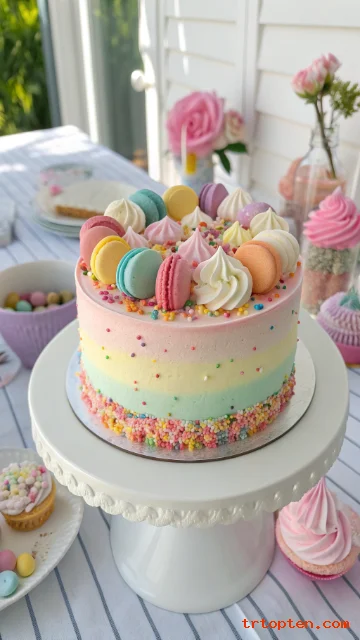 Ask for pastel ombre buttercream that fades from pink to blue to yellow around the sides. Cover the base in matching sprinkles and add a rainbow of meringue kisses or macarons on top.