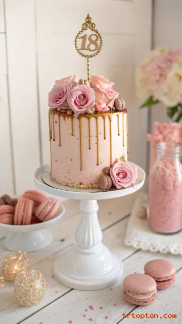 A sparkling rose gold drip cake feels elegant and instantly Instagram-ready. Soft blush tones, metallic drips, and a bold “18” topper turn a simple cake into a statement centerpiece.