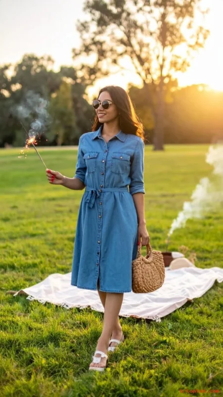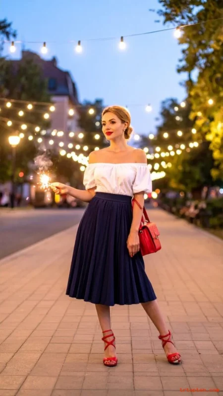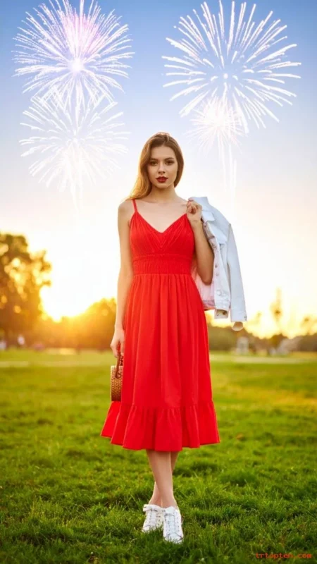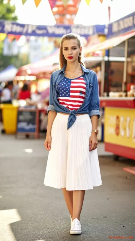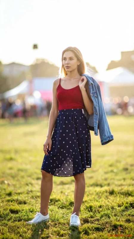 Finish with white sneakers or tan sandals and a small crossbody bag. You can toss on a light denim jacket when the fireworks start.