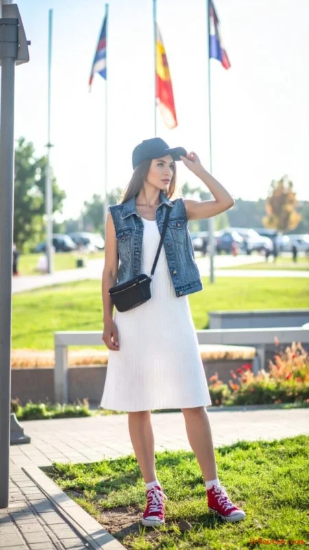 White Tank Dress with Denim Vest and Red Sneakers