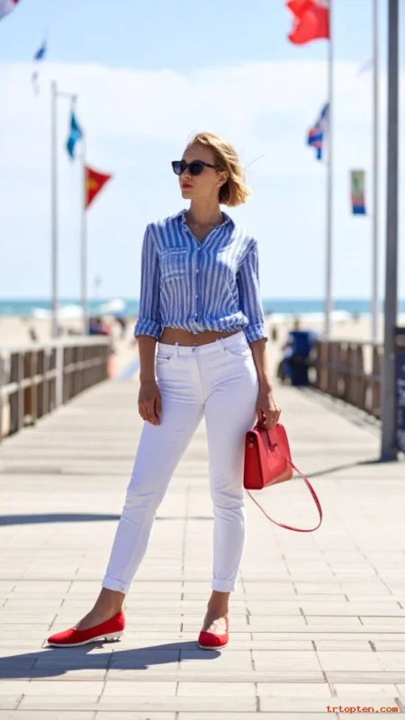 Tie a red bandana at your neck or in your hair for a festive finish. Choose sandals or espadrilles to match the clean summer vibe.