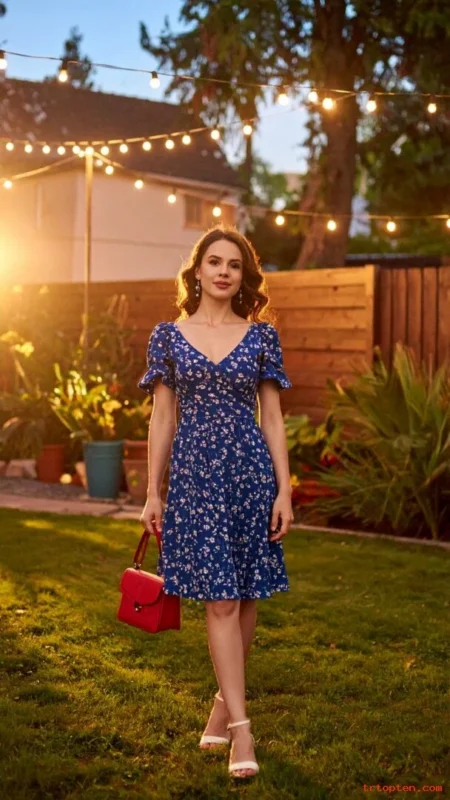 A blue floral dress feels romantic and summery. A red bag adds a bright accent that matches the holiday mood.