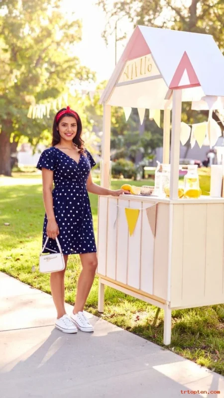 Choose a fit-and-flare dress for easy movement and a flattering shape. Keep shoes simple with white sneakers or tan sandals.