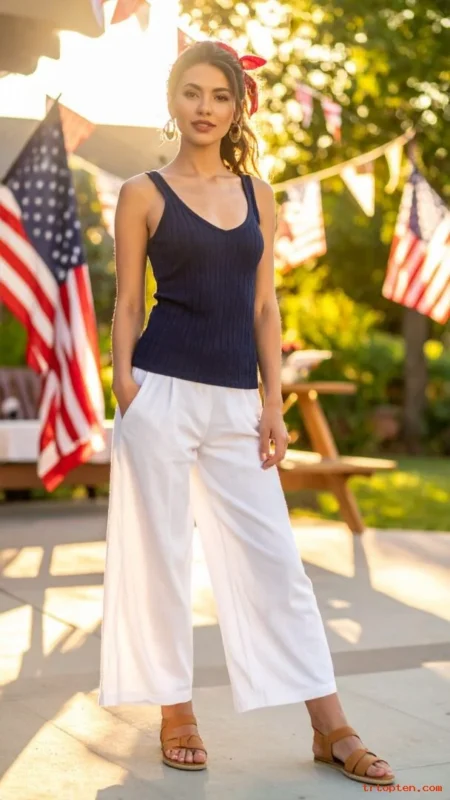 White wide-leg pants look polished and feel airy. A navy tank keeps the outfit grounded and easy to wear.