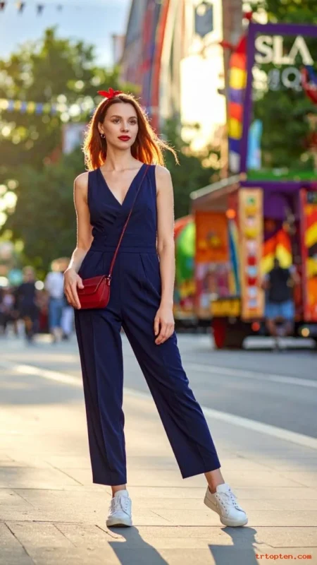 A navy jumpsuit looks sleek and still feels comfortable. White sneakers keep it grounded for walking and standing.