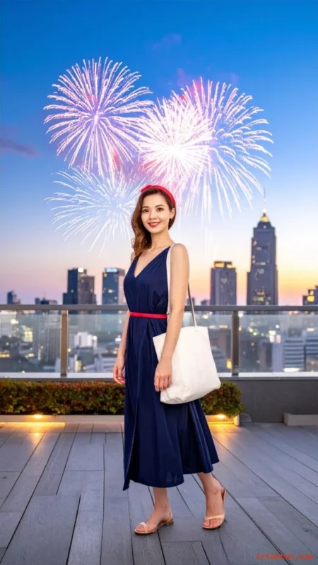 Wear simple earrings and keep hair loose or in a low bun. This outfit fits dinner, photos, and fireworks.