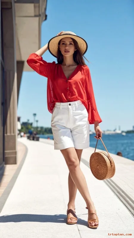 A red blouse brings bold color without needing a full dress. White shorts keep the outfit bright and summer-ready.