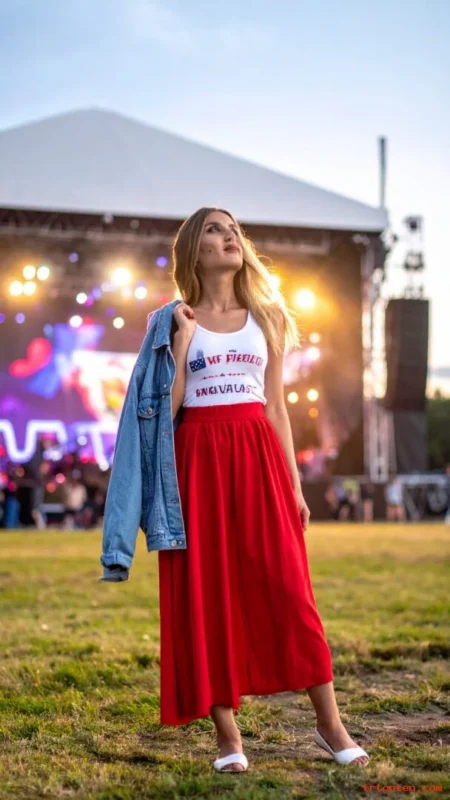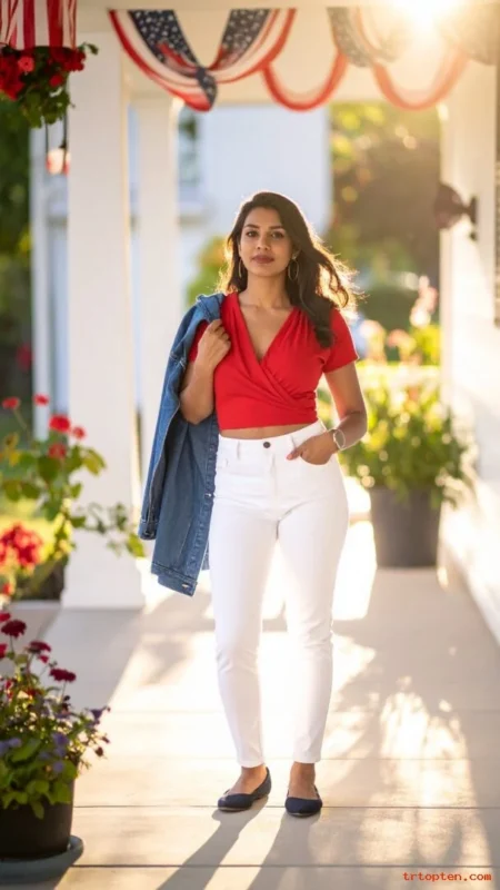 Add red bangles or a red scrunchie for a small holiday note.Finish with sandals or white sneakers. This outfit fits a daytime cookout or a casual concert.