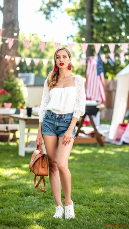 A white eyelet top looks crisp and breathable, and it keeps the color story simple. Denim shorts bring the classic summer vibe that fits a parade or a casual BBQ.