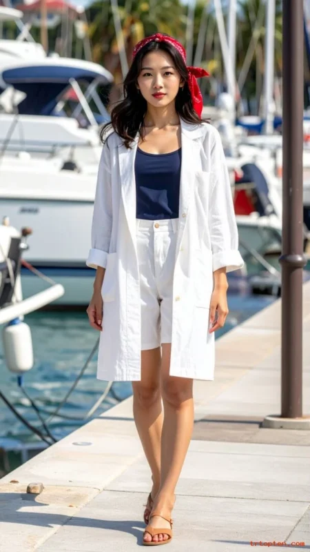 Add a red lip or red nail polish for a simple patriotic detail. Choose shorts with a tailored fit so the outfit looks sharp in photos.