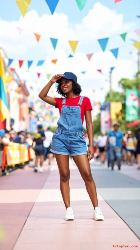 Denim overalls feel playful and comfortable for a casual holiday. A red tee makes the outfit look bright and on-theme.