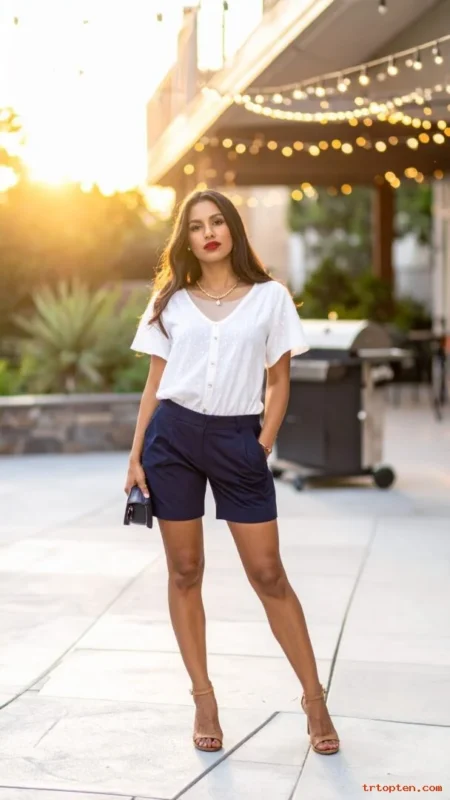 Navy shorts look crisp and clean without trying too hard. A white blouse makes the outfit feel pulled together for a party.