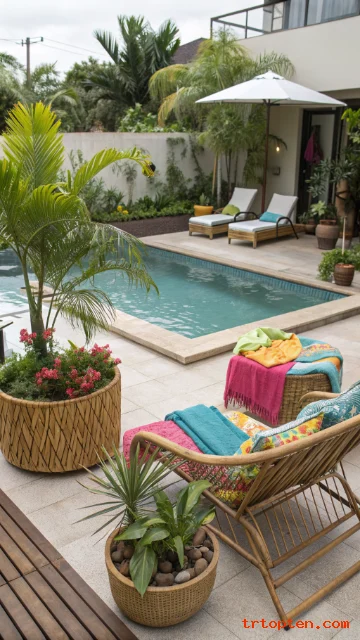 A theme makes your pool feel like a getaway. Large planters let you control soil and watering. Palms and broad leaves add drama fast.