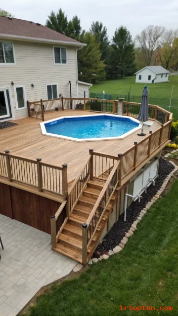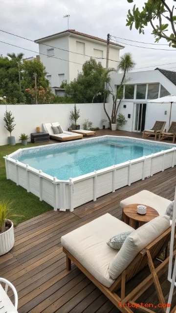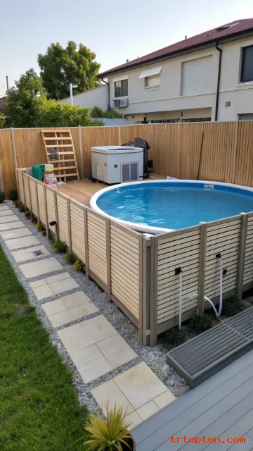 Add a deck, skirt panels, or faux stone cladding around the pool wall. Use matching landscaping and lighting to make the area feel planned.