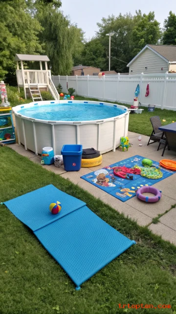 Use pavers, gravel, or decking to create a solid surface. Add edging and drainage to move water away from the pool wall.