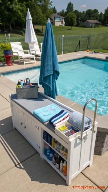 A supply station keeps swim days organized. It reduces wet footprints going back inside. It also makes your pool feel like a planned outdoor room.