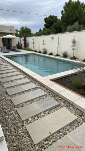 Choose smooth pea gravel for comfort. Border the gravel with metal edging or bricks to stop spread. Place stones from the gate to the pool entry.