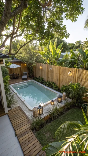 Bamboo screening gives instant texture and privacy. It hides the pool wall and equipment lines. It also creates a tropical vibe.