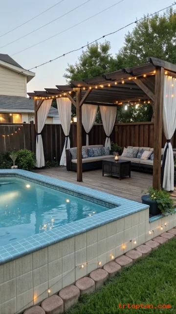 Curtains can hide the pool wall and add softness. They also help block wind and create privacy. This idea works best on a deck edge.