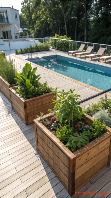Integrated planters add greenery and soften hard edges on a pool deck. Plants create a relaxing vibe and help your deck blend into the yard. This idea works with both modern and rustic styles.