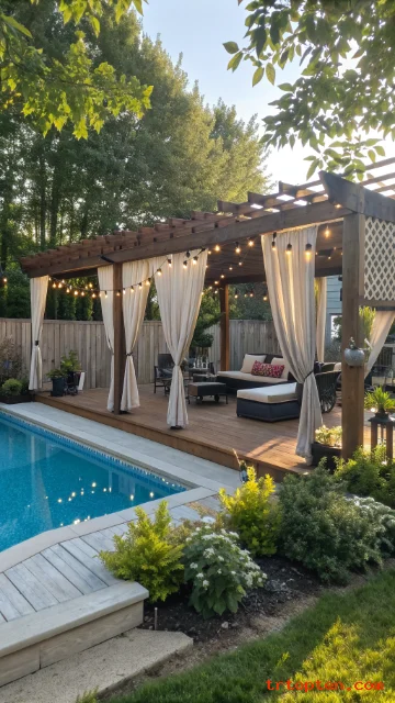 A pergola adds shade and makes the pool deck feel like an outdoor room. It also gives you a place to hang lights, fans, or curtains. This is great for hot climates and strong sun.