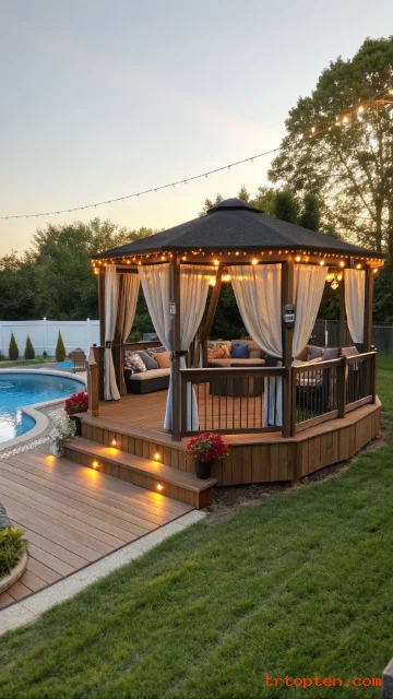 Anchor the gazebo securely to the deck framing. Add curtains or screens for bugs and privacy. Use soft outdoor lighting to make the gazebo usable at night.