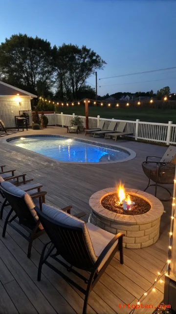 A fire pit adds a night-time hangout spot that extends pool season. It creates contrast between warm and cool, which feels cozy. This works best when the fire area sits a safe distance from the pool.