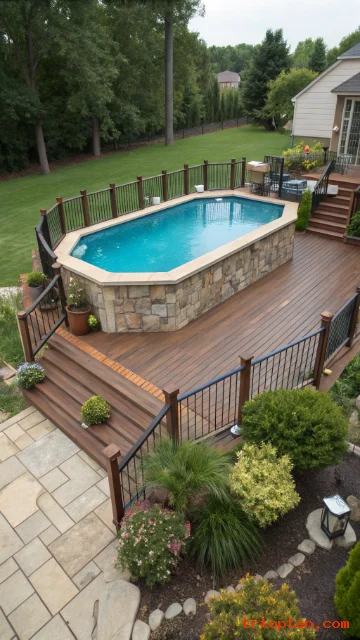 Mixed materials create visual depth and can hide the pool wall. A stone skirt makes the pool look more permanent and upscale. The wood or composite top stays comfortable for bare feet.