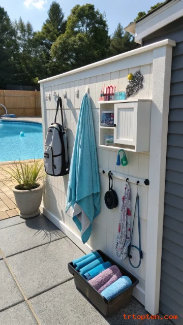 Install weatherproof hooks and a rod for towels. Add a small cabinet for sunscreen and first-aid supplies. Paint the wall a light color to keep the area bright and fresh.