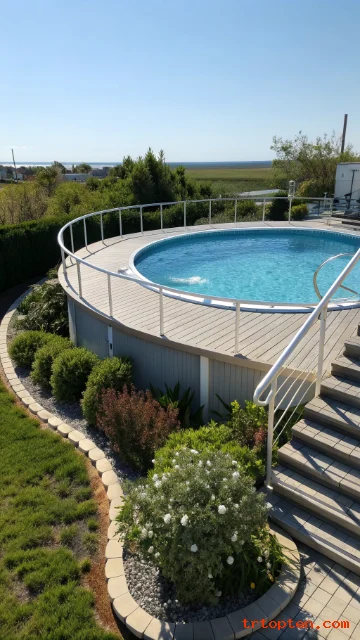 A curved deck edge looks smooth and custom around a round pool. It softens the overall shape and feels more natural in the landscape. This design often looks more expensive than it is.