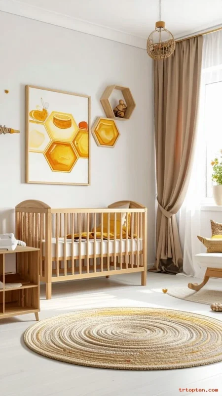 Use honeycomb decals or wallpaper on one wall for a playful detail. Choose muted yellow and soft gray so it looks modern and calm. Add a small bee garland near the top for extra charm.