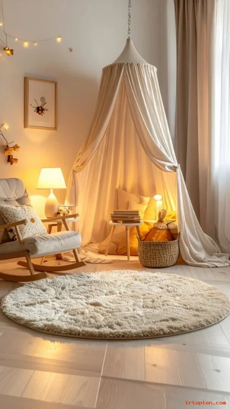 Use a rug to define the corner so it feels like a mini space. Keep lighting warm and gentle for bedtime stories. This makes the nursery feel special without needing lots of decor.