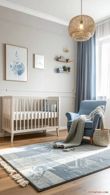 A good rug adds warmth and absorbs sound. It also ties the theme together from the ground up. Choose a size that fits under the crib and chair area for balance.