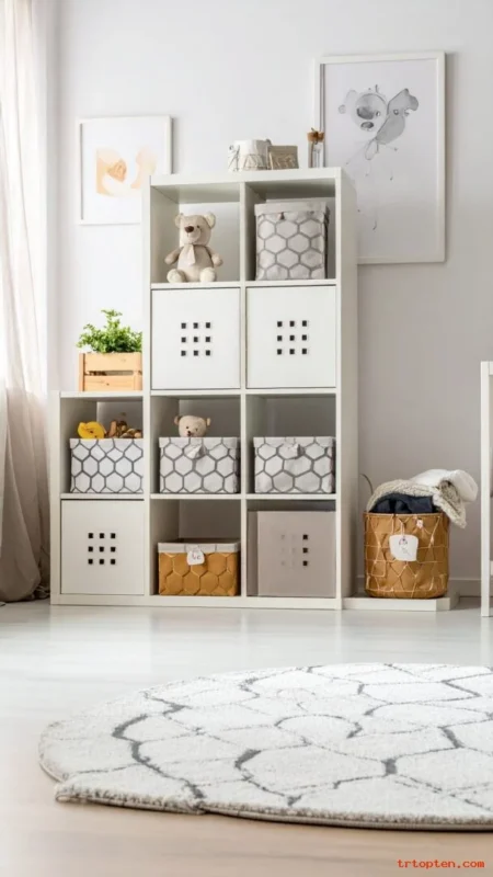 Use cube storage with honeycomb-pattern fabric bins. Choose colors like cream, gray, and soft yellow. Label bins with simple tags like “diapers,” “swaddles,” and “toys.”