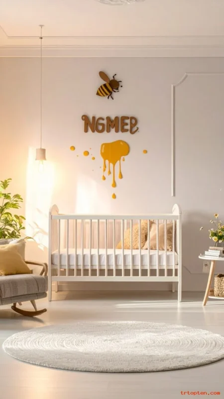 Match the sign color to the room’s wood tones. Add one tiny bee icon for a cute theme link. This personal touch makes the nursery feel unique.