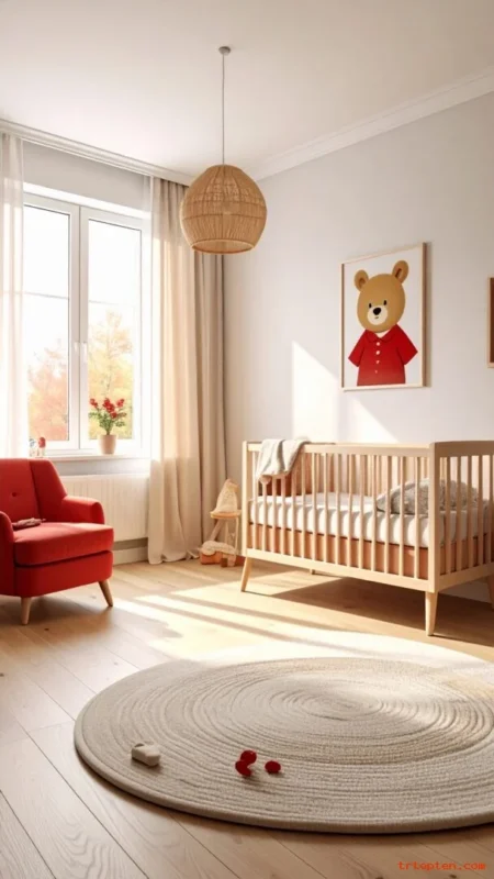 Red works best when it appears in tiny repeats. This makes the Pooh reference clear but still calm. The room feels balanced and sweet.