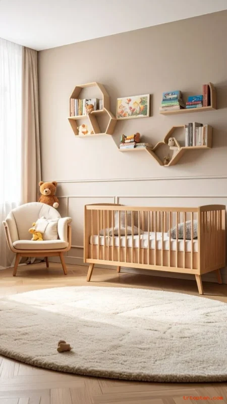 Book ledges create decor that also supports learning. They also add easy color in a controlled way. This makes the nursery feel alive and personal.