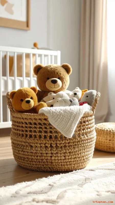 Create one basket just for plush toys. Place Pooh and friends sitting upright so it looks styled, not messy. Choose a basket with a lid or handle for easy cleanup.