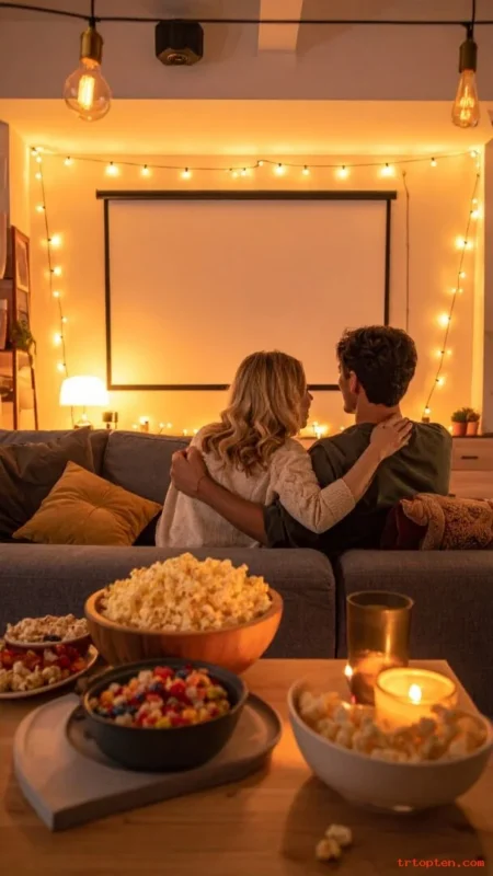 Pick one movie you both wanted to watch and plan around it. Dim the lights, add a projector if you have one, and build a snack board. Set up pillows and blankets so it feels like a cozy lounge.