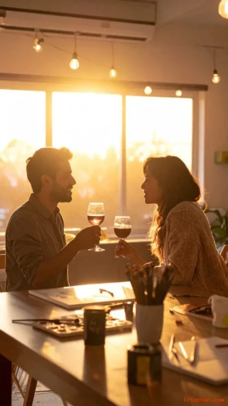 Buy two small canvases and a simple acrylic set. Pour a drink you both like or make mocktails if you prefer. Pick one easy theme, like mountains, flowers, or a sunset.
