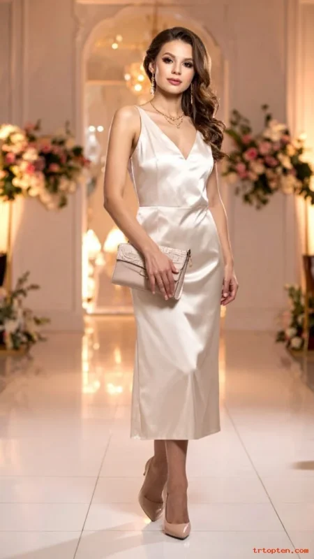 Add gold or pearl jewelry and a structured bag. Pair with nude heels for a clean finish. Keep hair sleek to match the satin shine.